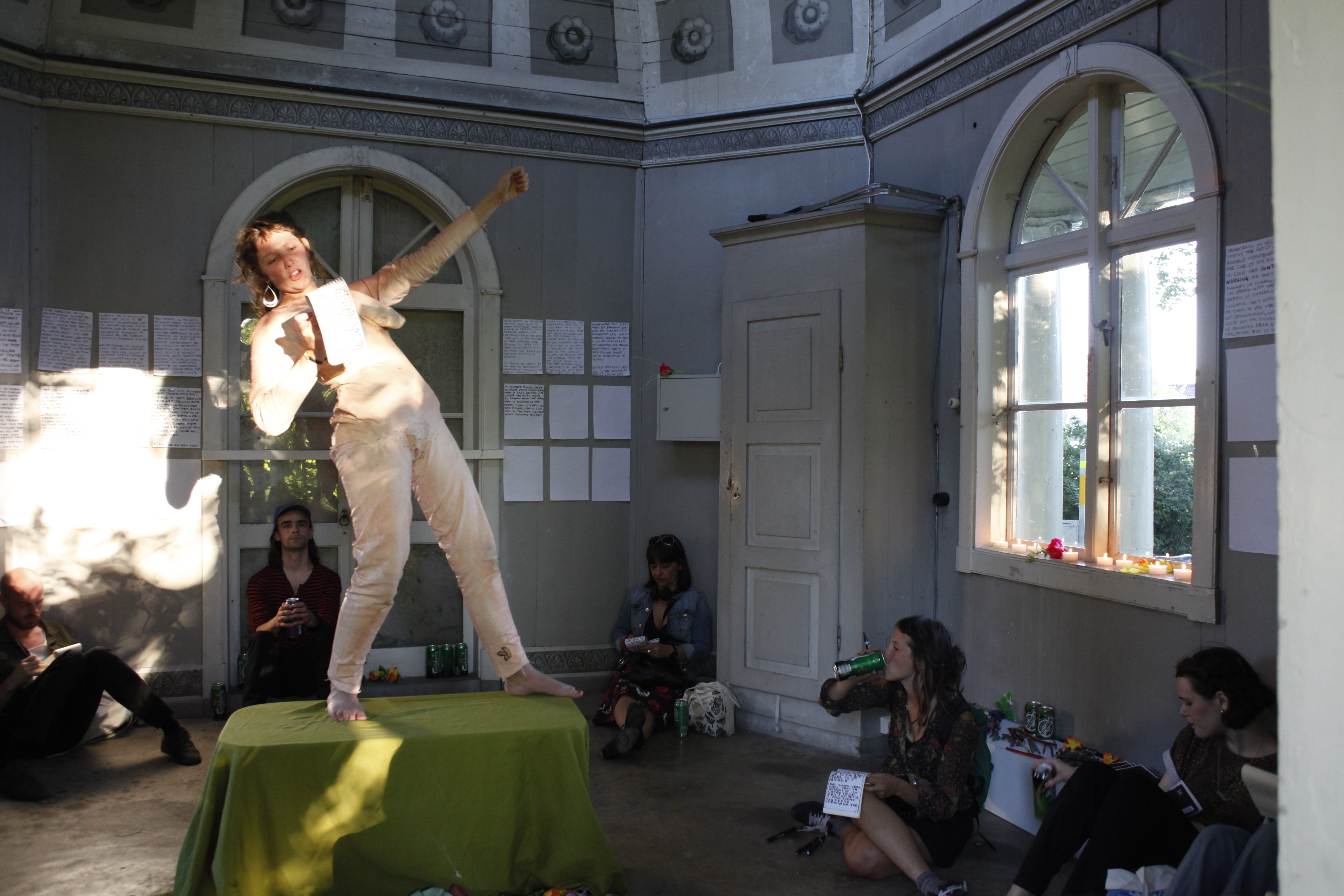 Kallipolis was a collaged artists manifesto, made up from work by the Situationists, Claus Oldenburg and more. It was read aloud while the audience drew the “nude” model in their own copies of “Kalipolis”.